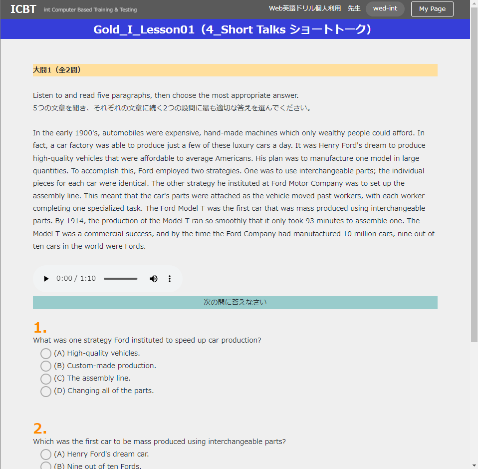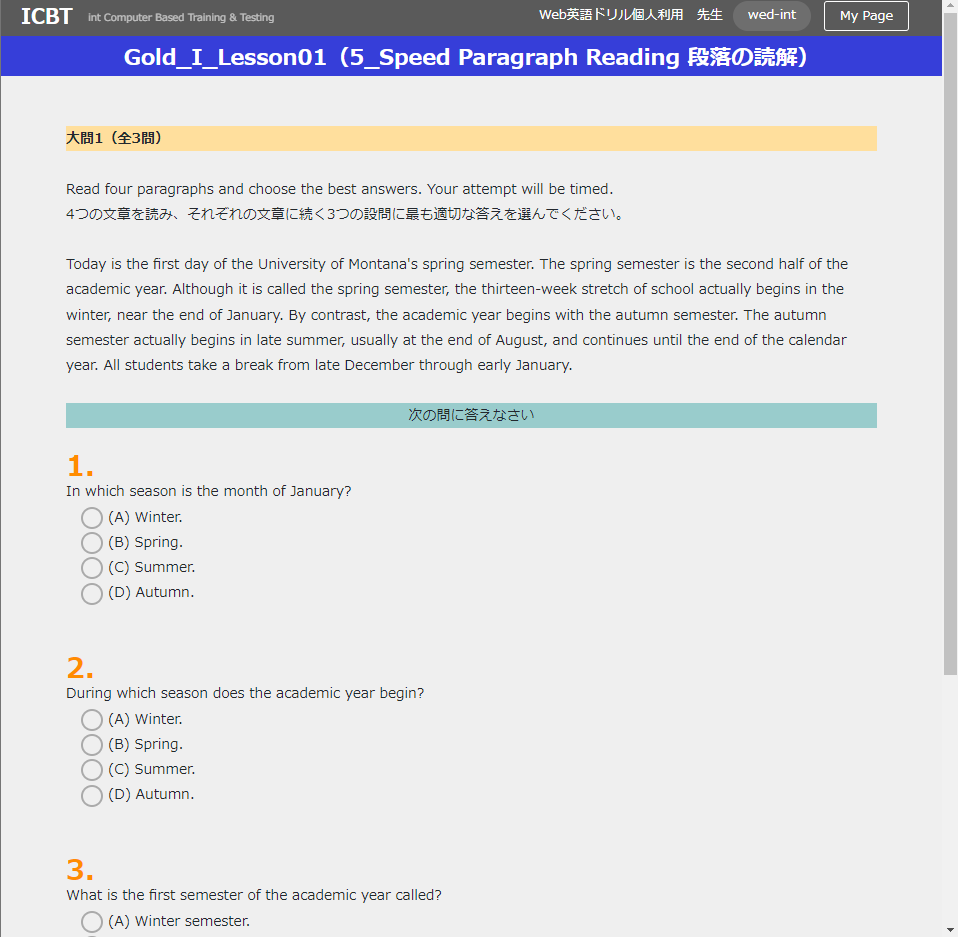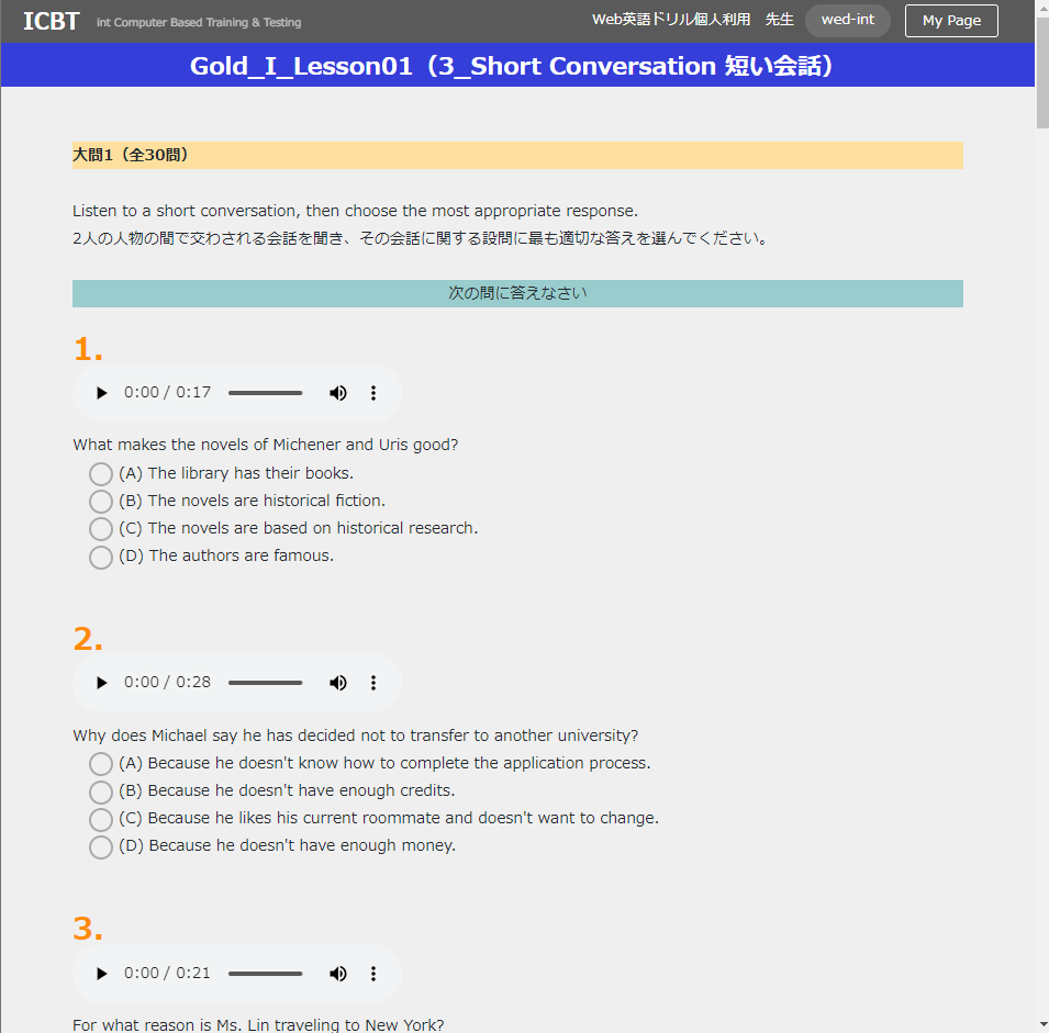 ③質問文を読んで、4つの英文から正しいものを選択します。