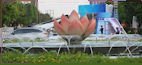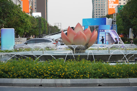 ホーチミンの中心部を通るグエンフエ通りのホーチミン人民委員会庁舎の前にある噴水と蓮の花。