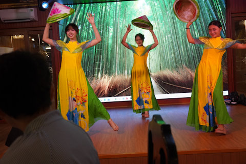 夕食でのショー。民族舞踊か、背景の写真は京都・嵐山? |