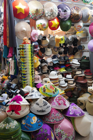 ベトナムの三角帽子は「ノンラー」という。観光客用にいろいろなデザイン絵が施されている。地元ではヤシやラタニアの葉で縫い合わせたままで使われるのが一般的。ベトナムの象徴的な存在で、農作業者はほとんどこのノンラーを被っている。 |