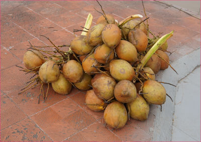 ジャックフルーツやパラミツはドリアンと紛らわしい。食べ方も難しいらしい。独特の甘い香りと柿・パイン・アボカドを合わせたような濃厚な味わいがある。 ココナッツの実 |