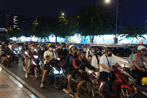 帰宅を急ぐバイクの群れ |