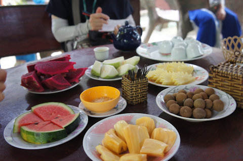 ココナツ椰子の実 グァバ、パパイヤ、マンゴー、パイナップル、ドラゴンフルーツ、パッションフルーツなど。バナナが甘くておいしかった。スイカはあまり味がない。 ココナッツを加工したキャンディをお土産に買った。あまり甘くはないがココナッツに自然の味わいがありあとを引いた。 |