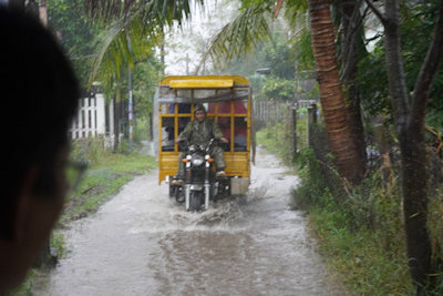 昼食のレストランに向かうのに、豪雨の中、左の写真のようなサバイクの牽引車に乗る。道路は陥没していた。 張り合って爺さんバイク雨模様