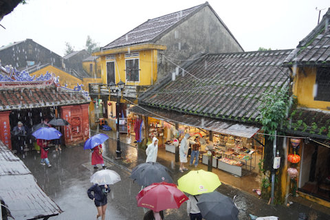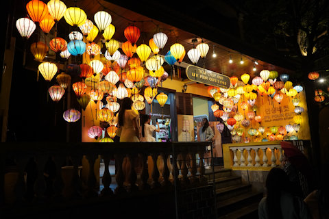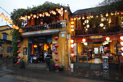 雨上がりにけぶるランタンの灯りが幻想的だった。ランタン祭りが人気のようだが、なぜランタンなのか不明。祭りと関係なく、多くのお店でランタンを飾っていて、夜には映えて独特の郷愁的な雰囲気を醸していた。 ホイアンはランタン明かりのなつかしさ