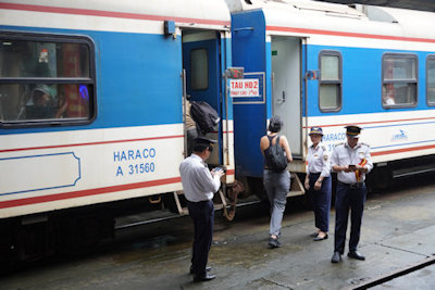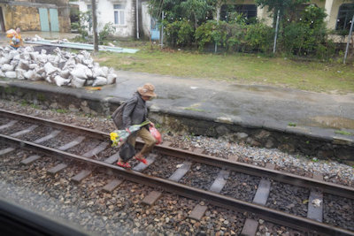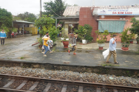 ダナンからランコーまで列車移動ダナンからランコー方面に向かう列車、ランコーで下車。1日2〜3便程度のらしくて観光列車のような雰囲気だった。