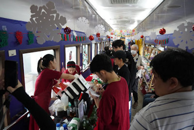売店では、飲料・スナック・オモチャ・お土産など、なんでもあった。 コーラを飲みながら、ベトナムの演歌を楽しんだ。日本でも観光列車でやったらどうだろう。 |