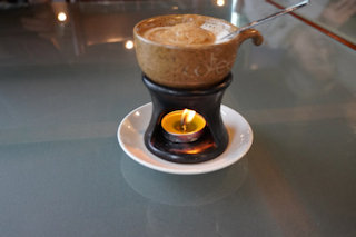 バスでちょっと走ったところの休憩所でベトナムロコーヒーを頼んだ。いろいろな飲み方があるようだが、ここでは暖かいコーヒーを飲めるようにカップをろうそくを灯して暖めている。この店だけの飲み方かもしれないが、濃厚で甘く、おいしかった。 |