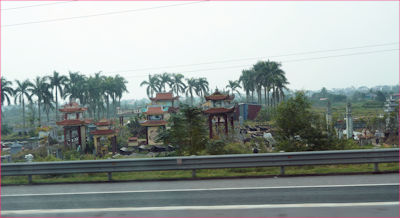 雨の田園風景。農道沿いにヤシの木が植えられている。 晴れていれば素晴らして田園風景なのだが残念。 ヤシの木やバナナ畑に囲まれた墓地 |
